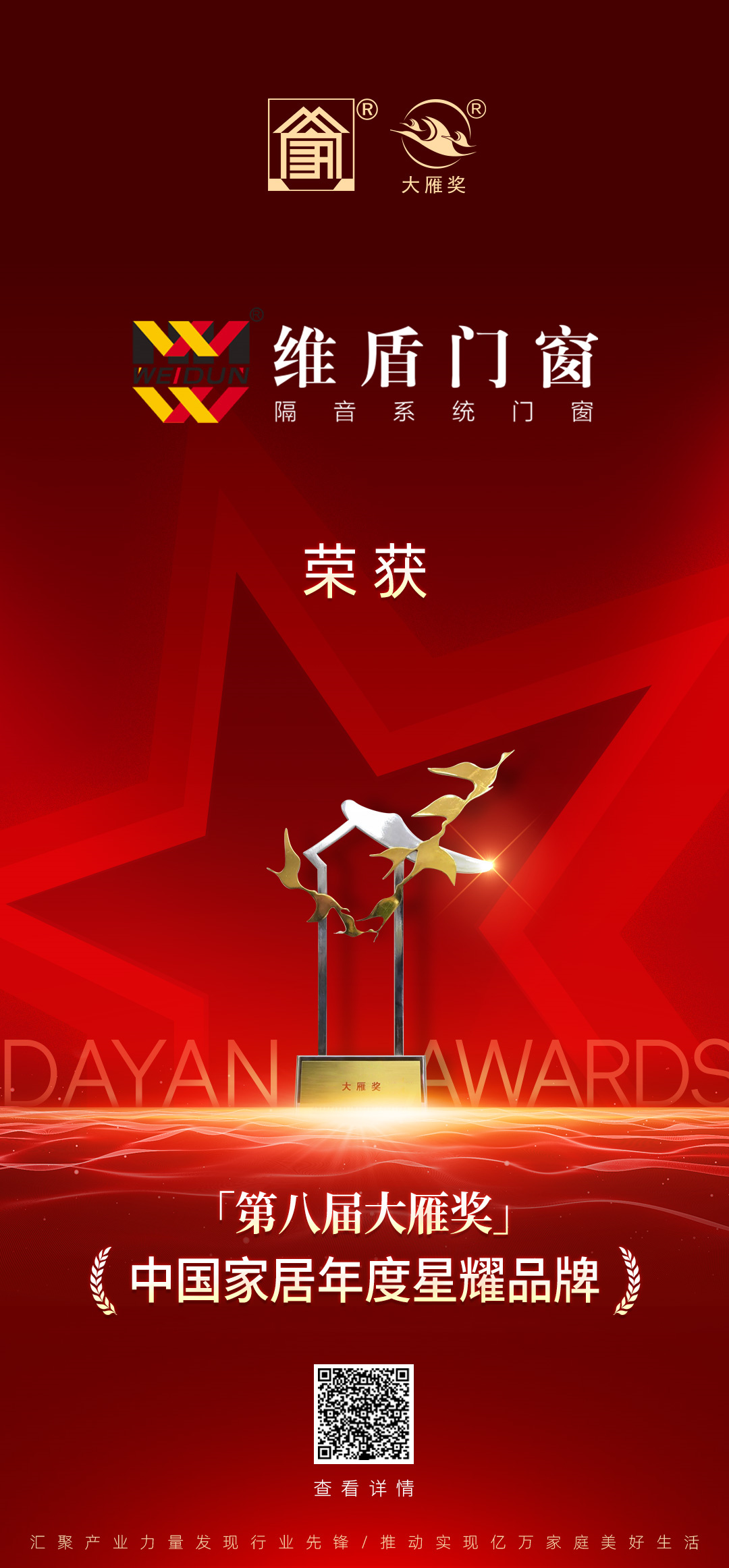 “大雁獎”現(xiàn)已成為國內(nèi)家居行業(yè)內(nèi)最具影響力和最關(guān)注度的行業(yè)盛典,被譽為家居類最高獎項,是享有家具界行業(yè)“奧斯卡”美譽的一大頒獎盛典,維盾門窗榮獲“第八屆大雁獎中國家居年度星耀品牌”此項榮譽,實屬證明了在整個大家居建材行業(yè)與消費者心中,擁有不可替代的位置,并且以精湛的研發(fā)技術(shù)、高質(zhì)量的產(chǎn)品、完善的服務(wù)體系、夯實的品牌實力贏得高度的認(rèn)可。