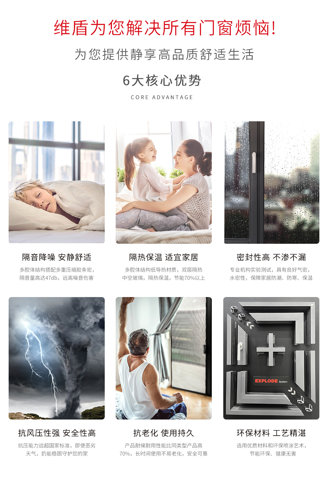 工藝配置:連體式防磕碰金屬護角,方形閉口扣條,一體角碼WESS注膠,微波硫化焊接式/一體折彎中央密封膠條,防塵條,中挺榫卯連接,泰諾風靜音傳動鎖條,地漏排水